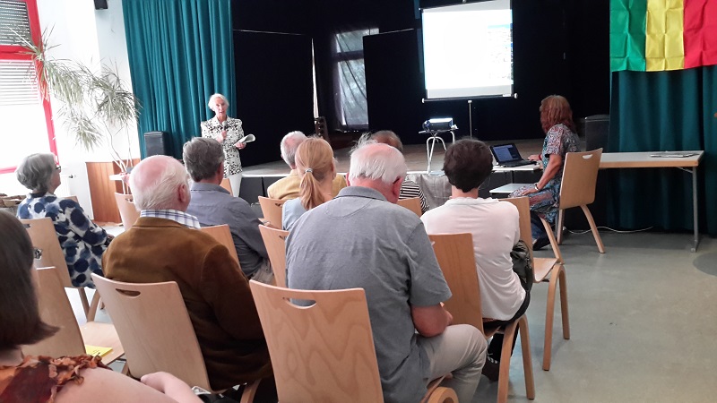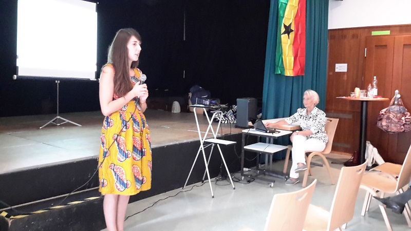 Das anschließende Sommerfest begann mit der Begrüßung und Vorstellung des Vereins durch Annette Turmann. Einen Einblick in das studentische Leben in Cape Coast eröffnete Natalie Chirchietti von der Hochschule Bonn-Rhein-Sieg mit ihrem anschaulichen Bericht über ihre Erfahrungen während eines Praxissemesters an der dortigen Universität. In dem Vortrag „Situation der Frauen in Cape Coast und Schwangerschaft unter Minderjährigen in Cape Coast“ von Edith de Vos, Leiterin der Baobab Children Foundation, Ghana, wurden ein Problembereich, aber auch mögliche Lösungsansätze aufgezeigt. Danach stellte Anthony Thompson die Symbolik der Adinkramotive und ihre traditionelle und moderne Nutzung vor, und mit Clariett Genneper konnten alle Tanzwilligen den Adowa-Tanz erlernen. Nachdem sich die Gäste am ghanaischen Büfett gestärkt hatten, wurde zu moderner ghanaischer Musik getanzt.
